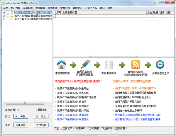 ET2(EditorTools)全自动采集器是中小网站自动更新利器,全自动采集发布,静默工作无须人工干预;独立软件免除网站性能消耗;安全稳定,可长年累月不间断工作;支持任何网站和数据库的采集发布,软件内置了包括discuz,disuzX1,phpwind,dvbbs,dedecms,dede淘宝客,wordpress,phpcms,帝国cms,动易,新云,typecho,emblog,pbdigg,php168,bbsxp,phpbb,百度空间等常用系统的范例。本软件适合需要长期更新内容的网站使用,不需要你对现有论坛或网站做任何修改。