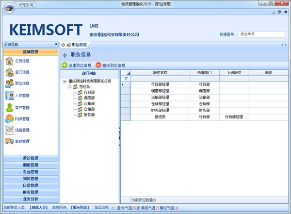 1、基础管理:公司信息、部门信息、职位信息、人员管理、客户管理、网点管理、线路管理、车辆管理。
