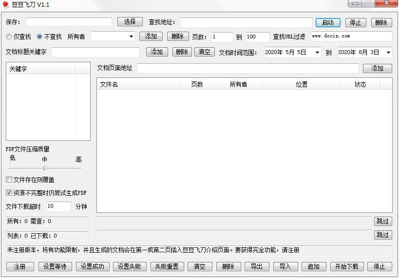 1、 自动搜索文档:可根据文档页数,文档上传者,文档上传时间以及文档标题关键字进行过滤搜索。豆豆飞刀绿色版可指定url地址查找过滤,可快速获取某个文档上传者的合符查找条件的所有文档,查找结果显示在列表中。