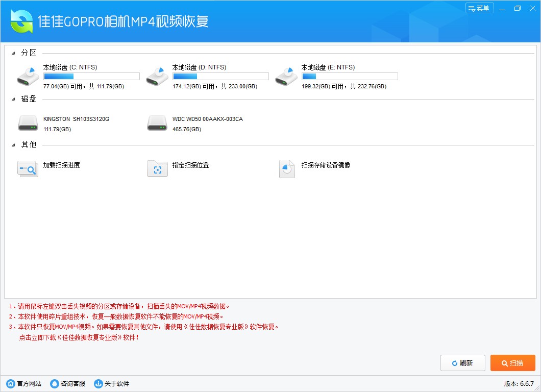 佳佳Gopro MP4视频恢复是一款专业实用的视频恢复软件,能够帮助用户很好地恢复由于各种误操作而导致丢失的MP4视频文件,可以完美恢复GoPro运动相机拍摄的MP4格式视频,恢复出来的文件可以正常播放和二次编辑。