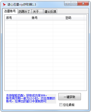 遂心迅雷VIP获取器包含迅雷VIP帐号一键获取和一键防踢补丁,方便有效。迅雷会员可使用离线下载,多线程下载,高速通道下载,迅雷看看弹出式播放,去广告等等特权!