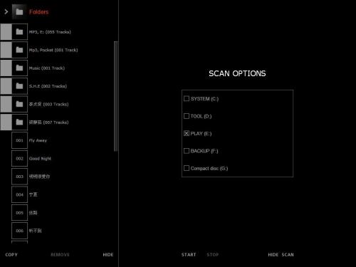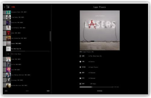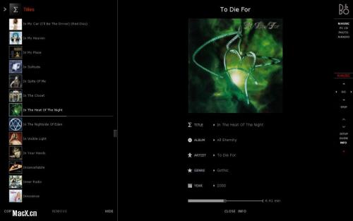 3、BeoPlayer的界面设计非常独特,超出了我们对一般播放软件的想象。操作面板隐藏在屏幕右侧,操作界面完全打开之后,它会覆盖整个桌面,并且应用了动态的拉开式。第一次运行时,它会为您扫描硬盘,搜索电脑上的音乐,而后列出仔细清单,您可以根据歌手、曲目及文件名称等作顺序排列。Beoplayer的播放音质几乎无可挑剔,因此受到很多音乐发烧友的青睐。