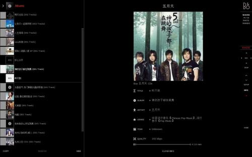 4、BeoPlayer的配色是以黑色为底,搭配白色、灰色的文字,及少部分画龙点睛的红色,窗口也打破传统观念,运行时只在系统托盘有一图标,当鼠标滑动到桌面右侧边缘时,会出现一个黑色的小三角形,在小三角形点一下鼠标会出现BeoPlayer的控制面板,面板里包含主要的控制功能,如播放、音量、设置等,当鼠标移开面板时,面板又会自动收回。