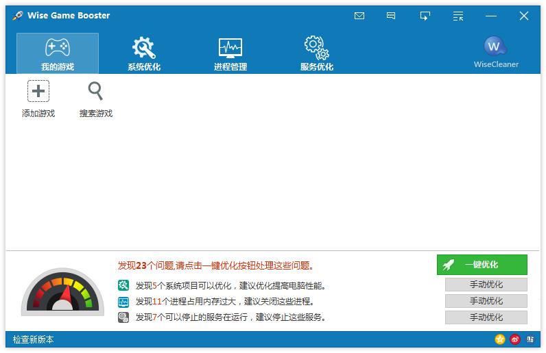 Wise Game Booster是一款提升游戏性能、加速游戏的速度让低配置电脑玩游戏像高配置电脑一样,这款软件设计的主要目的是让用户在不用升级硬件的情况下最大可能的提高游戏性能,其工作原理是优化系统相关设置参数,关闭不必要的进程和服务,把腾出的资源集中在游戏上,从而获得最佳的游戏体验。