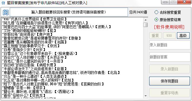 知识问答答案搜索工具是一款实用的日常知识问答竞赛答案搜索软件,拥有共3400道知识竞赛和网络单招的试题及答案,支持语句首拼音搜索和汉字搜索,还可以自己添加新的题目和答案,用户使用工具时点击搜索右框树木标签即可导入自定义题库。