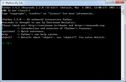 在这里有Anaconda管理器(Anaconda Command Prompt),IPython Notebook,IPython QT,IPython,Spyder。点击IPython,就进入了IPython的界面。