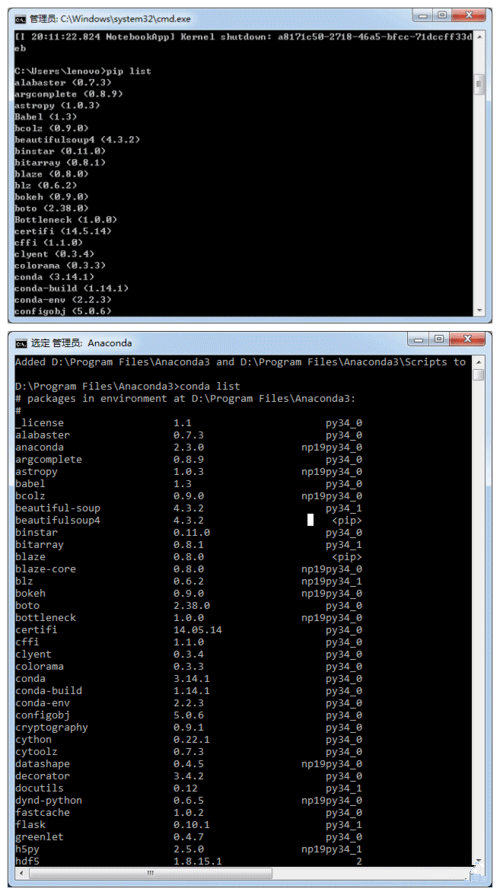 到此为止,IPython就算安装成功了,是不是很方便,很简单!之后,我们可以在命令行(也就是cmd)中输入pip list或者在Anaconda管理器中输入conda list来查看已经安装的库,效果如下: