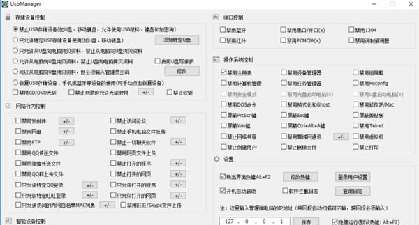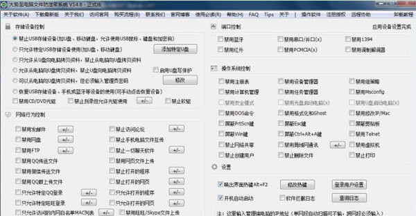 禁用u盘启动电脑、禁用dos命令、禁用格式化和ghost、禁止修改ip/mac、屏蔽prtscn、屏蔽esc键、屏蔽剪贴板、禁止网络共享、禁止查看进程、屏蔽win键、屏蔽ctrl+alt+a键、禁用telnet、开机系统自动隐藏运行。