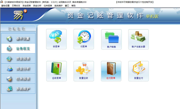 【业务收支】收款记录、付款记录、账户转账、账户当前余额、应收记录、应收批量收款、应付记录、应付批量付款;