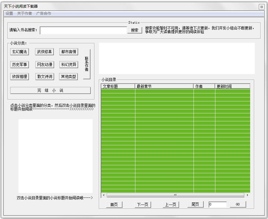 天下小说阅读下载器是一款小说下载器,软件完全无毒,请放心实用,不会向你的电脑写入任何东西,下载后解压即可运行,无需安装,什么时候不要随时删除,不会在你的电脑中留下任何垃圾文件;软件所提供的小说都是来自网络搜索,小说内容如有任何和软件作者无关,请不要随便删除目录中的TXT文件,删除后可能会导致软件不能阅读。