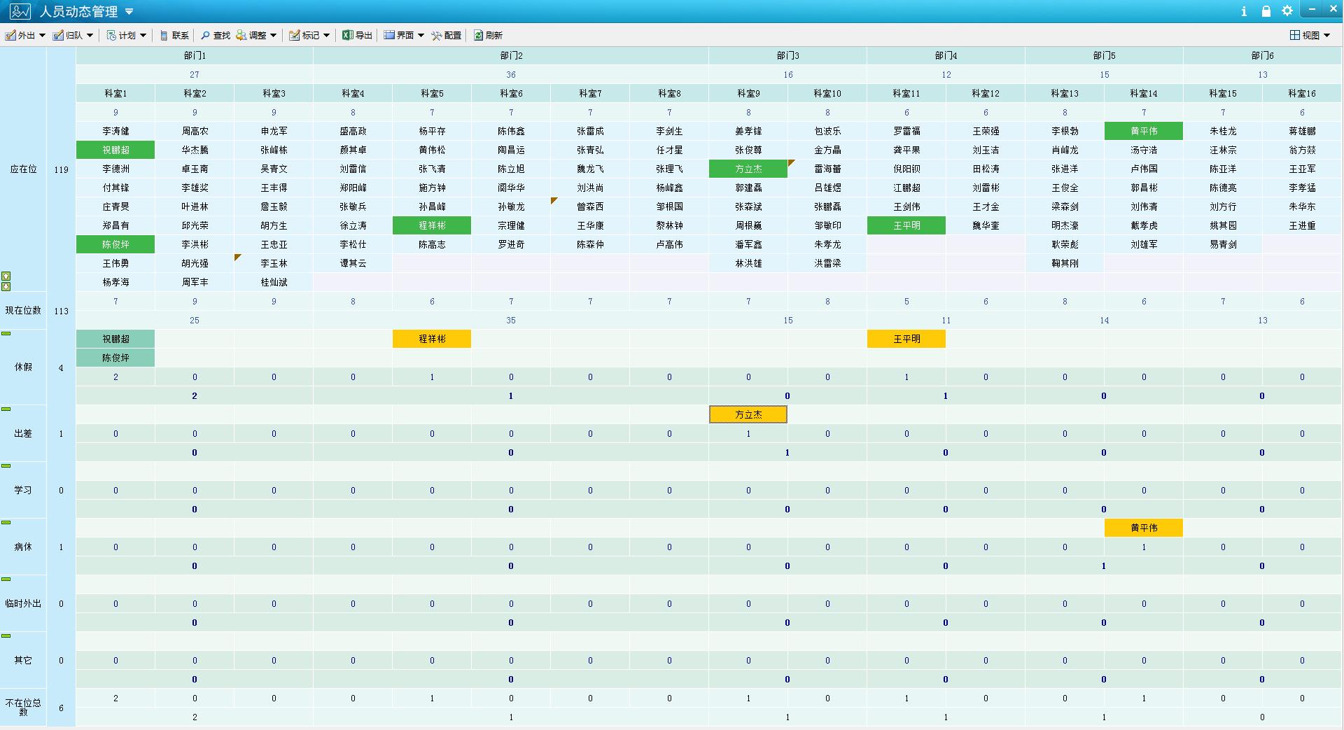 7.人员动态信息统计分析:系统可实现人员动态信息分布一览,实时查看人员在位情况和具体 的数量分布情况,统计出人员在位率、各类在外人员的数量比例,查询 人员的在外历史记录、在外次数及在外时长、联系记录、未外出人员等 信息,并可输出至 Excel 文档中进行二次编辑。 除以上基本功能外,系统还具有制定人员外出计划、标记事务消息、 人员生日提醒、批量登记人员出入、自动销假、设定出入管理制度、导 出人员分布一览表等功能。