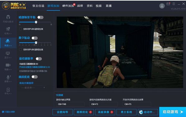 在任务栏上点击游戏加加,随后选择吃鸡++,即可进入吃鸡优化的配置界面,进入后,PUBG加加++绝地求生助手会自动读取玩家的CPU,内存,显卡等信息。