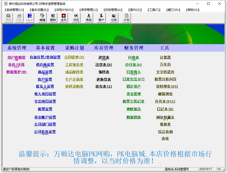 2.菜单栏分系统管理、基本信息管理、采购计划、库存管理、财务管理、操作、工具、窗口、帮助九个大的菜单项。