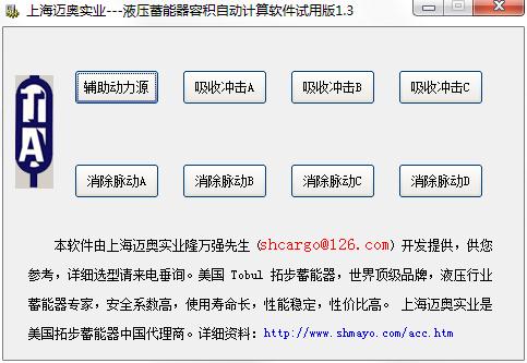 液压蓄能器容积计算软件是一款十分优秀的计算软件,界面简洁小巧,功能出众实用,支持计算的项目很多,如辅助动力源,吸收冲击A、B、C,和消除脉动A、B、C、D等等,不仅如此,还为大家提供准确的计算功能支持,软件是由上海迈奥实业开发提供,供您参考。