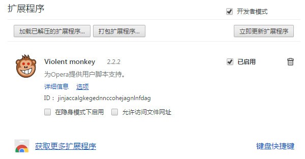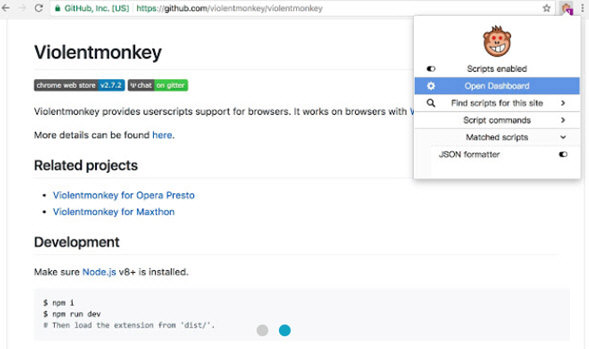 Violentmonkey是第一个可以用来让 Chrome 支持更多 UserScript 的 Chrome 插件扩展。一直号有“Chrome第二应用商店的”它可以加入更多的 Chrome 本身不支持的用户脚本功能它适用于基于 Blink 和 WebKit 的浏览器,像是 Chrome, Opera Next, Safari 和 Firefox 。