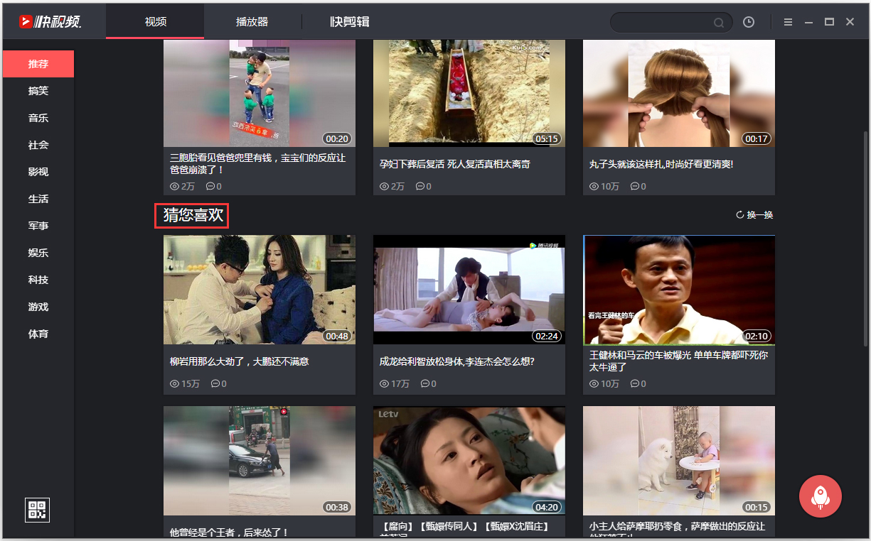 快视频是360影视推出的一款非常好玩的短视频聚合平台,快视频中包括搞笑、音乐、社会、影视、生活等简短视频,让你快速观看小视频,同时还配套快剪辑软件,赶快下载使用吧!