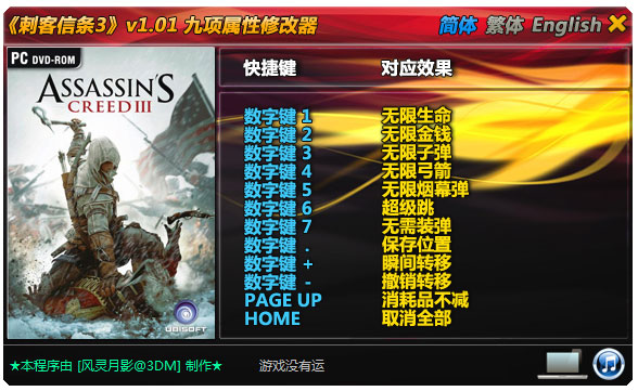 刺客信条3修改器对应游戏版本 :v1.01(如无意外也会支持其他游戏版本)