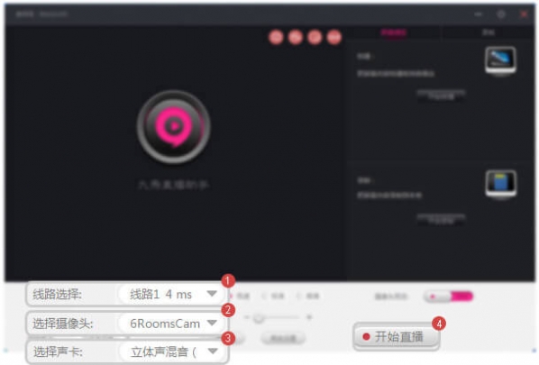 3、在软件窗口正确设置:①线路选择②摄像头③声卡;点击“开始直播”按钮进入直播间开始直播。