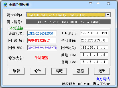 全能IP修改器可以读取IP地址、修改IP地址、子网掩码、网关、DNS。方便用于个人用户、网吧用户,方便快捷。