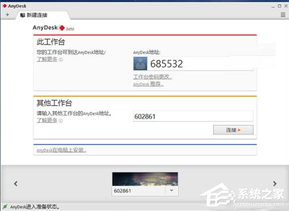 而在「其他工作台」一栏中,输入别人的 AnyDesk 地址并点击连接按钮,即可向对方电脑发出控制的请求,待被控电脑点击「接受」之后 ,即可开始远程控制对方桌面。