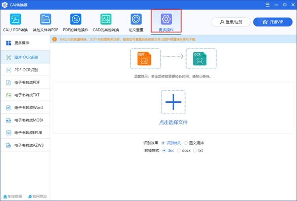 6、更多操作可以完成图片OCR识别、PDFOCR识别、及电子书格式转换等操作。
