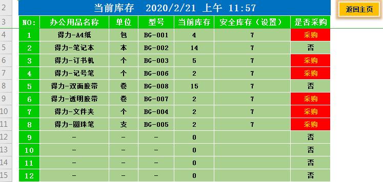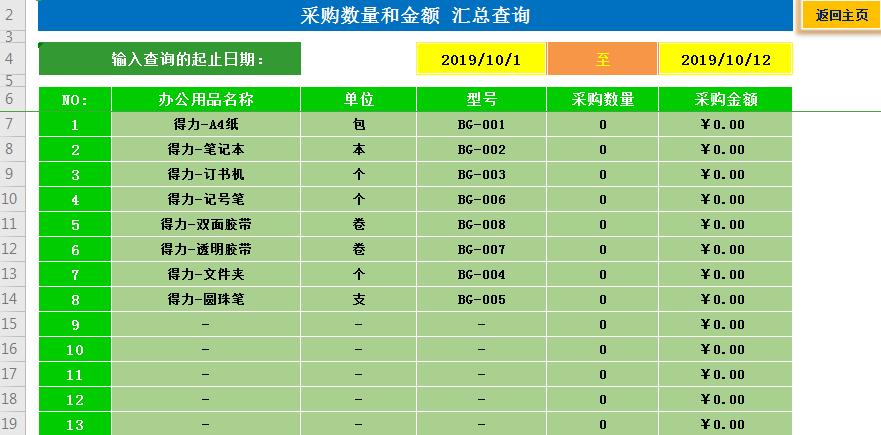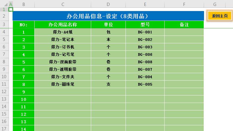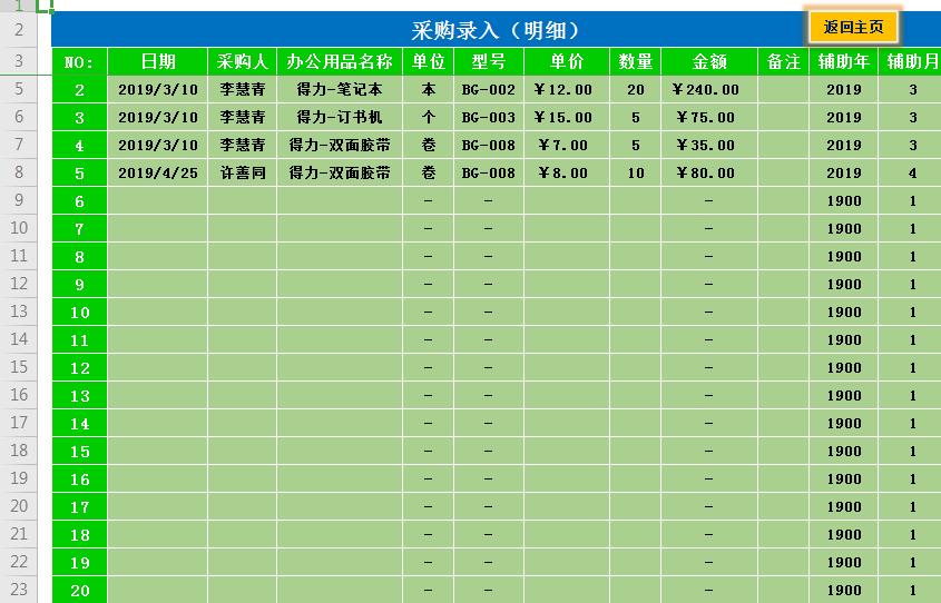 表格自带了一些示例数据,主要在:公办用品信息、采购录入、领用录入、期初库存等,可清除或改为自己的数据。