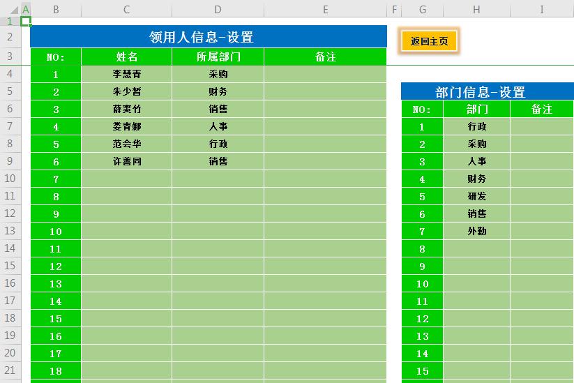 领用人、物品名称,通过下拉选择;所属部门、单位、型号,根据“办公用品信息”表的资料自动引用生成。
