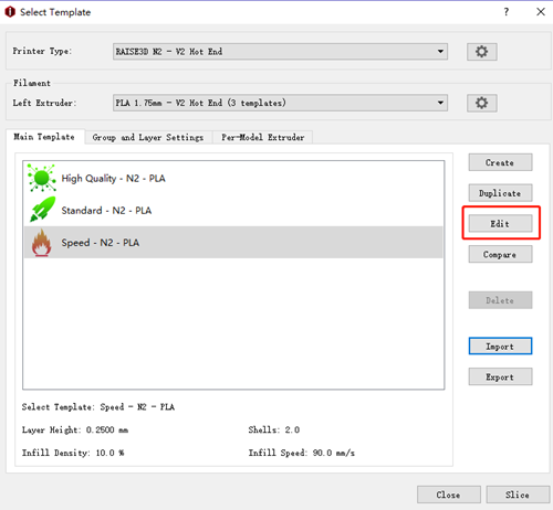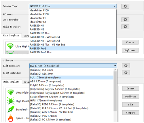 如果您使用的是带有V2热端的Raise3D N系列打印机,请同时选择打印机和灯丝作为V2。如果不使用V2热端,请确保将两者都选为标准配置文件。