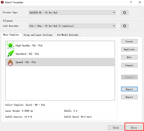 选择一个切片模板,或者通过复制三个现有模板中的一个来创建新模板。