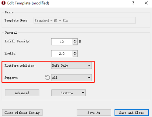 单击“编辑”按钮或双击模板(如果复制新模板,则不单击)。选择筏板类型和支撑类型,然后单击“保存并关闭”按钮。