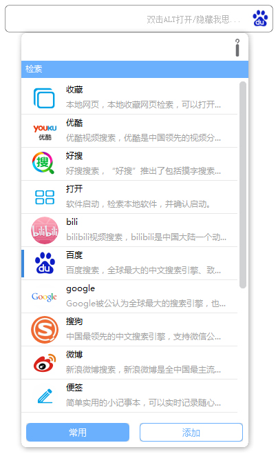 我思是一款简洁小巧、界面美观的桌面搜索小工具,集合了百度、360、谷歌、搜狗等多个搜索引擎,绿色安全无广告,是新一代的桌面搜索客户端。我思,用最简单的方式连接到一切服务需求和内容需求的生态级应用;我思,建立一种智能高效的生活、学习、娱乐方式。