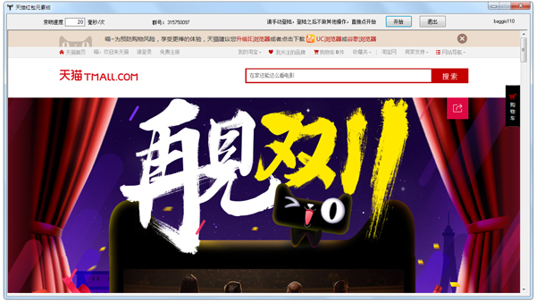 天猫全自动抽红包,打开脚本之后,手动登陆天猫,登陆之后,啥都不要动,直接点脚本上的开始!