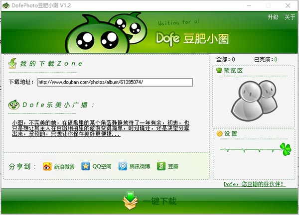 豆肥小图是一款十分实用的图像下载软件,主要你在这款软件里面输入豆瓣相册的地址,就可以一键进行下载。可以分享到微博、空间等各大平台,有很多人说豆瓣相册下载到电脑不方便,这款软件可以帮助你全部下载到电脑里,需要的可以来本站下载。