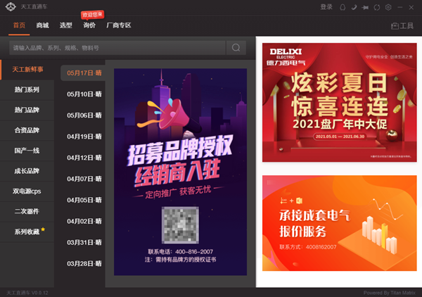 天工直通车电气软件包含了原件选型、采购预算等功能,为用户提供了非常便利的服务是一款十分不错的选材软件。同时软件还为用户提供了各种栏目,用户可以依据自己的需求来下载这些工具,有需要的小伙伴快来下载吧!