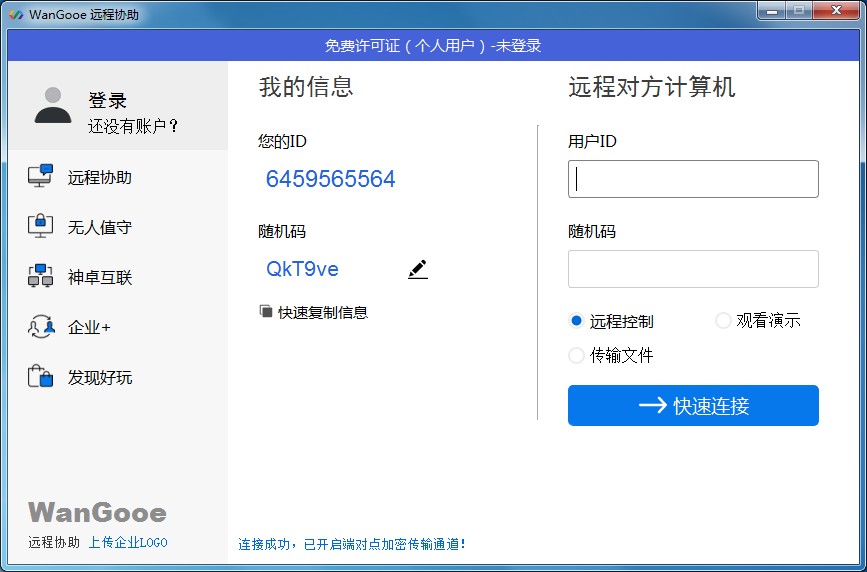 WanGooe是神卓推出的远程控制软件,适用于远程协助、售后支持等场景,依托神卓互联,为广大IT服务提供商以及服务中心专业人员提供免费便捷的远程桌面服务。