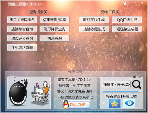 淘宝工具箱是七度工作室开发的一款为淘宝中小卖家提供的一款实用性、简便的查询工具,软件支持匿名查询淘宝隐形降权、店铺信誉信息、淘宝信用等信息查询,还可以获取IP地址、手机号码信息。
