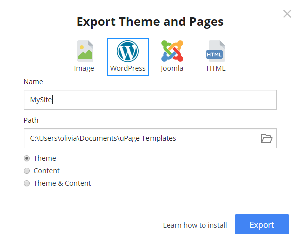 在Nicepage桌面中,还有其他几个导出选项:您可以导出到WordPress主题,Joomla!™模板,静态HTML网站或图像。