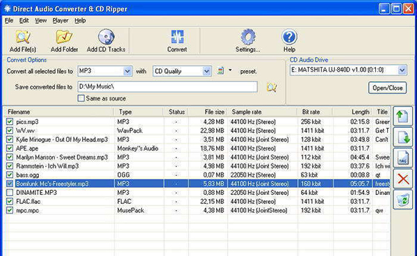 Direct Audio Converter & CD Ripper是一款多功能音频转换器,可以将一片文件在flac、ape、mp3、mp2、ac3、aac、wma、wav等多种音频格式之间进行相互转换,输出为最佳音质。还可以翻录CD,提取音乐并输出为常用的各类常见格式,有需要的小伙伴快来下载使用吧!