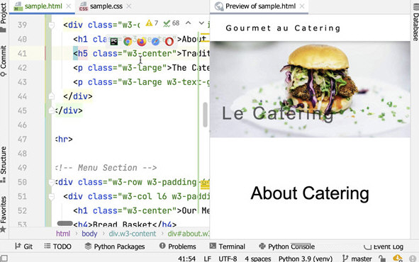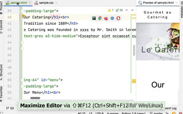 8、内置 HTML 预览,新的内置浏览器预览可以让您快速预览 HTML 文件。 IDE 中的任何 HTML 文件变更以及链接的 CSS 和 Javascript 文件的变更都会被立即保存,预览也将即时更新。 要打开预览,请点击编辑器右上角微件中的 PyCharm Logo 图标。