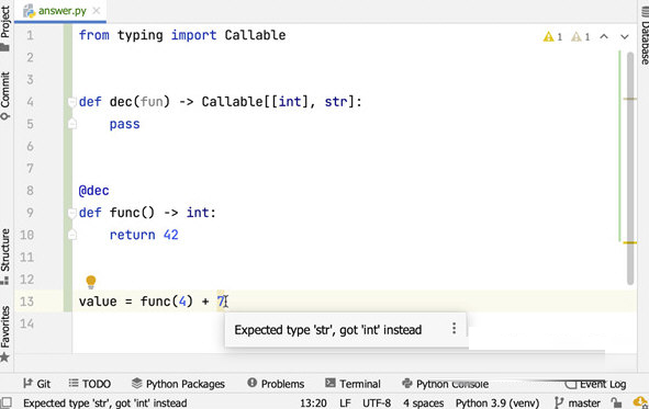 6、修饰方法的输入建议,PyCharm 可以根据修饰器的类型和类型提示验证修饰方法的类型。