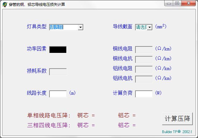 2、输入灯具类型、导线截面、功率因素、铜线电阻、损耗系数、线路长度等就可以计算出单向线路电压降和三相四线电压降。