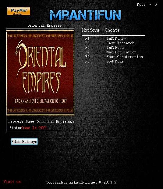东方帝国六项修改器,可获得无限金钱,无限食物等六项实用功能,有需要的玩家朋友快来下载使用吧。
