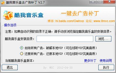 酷我音乐盒去广告补丁,用来去除酷我音乐盒子的弹窗和播放广告,并且破解了本地VIP功能。此补丁原理很简单,依旧是对那两个img文件的修改,有兴趣的朋友自己对比一下备份文件就知道改动了哪里。由于只涉及文件的修改,很简单,没有涉及到可执行程序的修改,所以实现起来也就简单了许多。