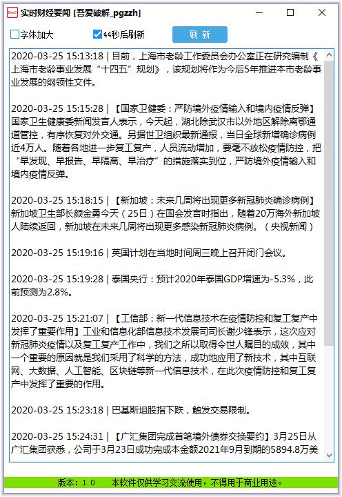 实时财经要闻是由个人自制的一款非常不错的财经新闻采集软件,该软件可以帮助我们实时接收到来自世界各地的财经要闻,每隔六十秒就会自动更新一次,并且我们还能够随时复制内容进行传播,非常适合股票工作者进行使用。