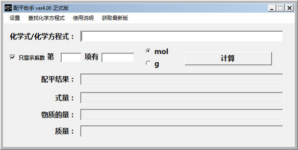 配平助手可以配平元素数>=项数2情况下的所有化学方程式(当然是要正确的化学方程式)、以及离子方程式。可以在配平前预先设定某一项的系数(这个功能在配平元素数=项数2时很有用)。最长配平过H2 + Ca(CN)2 + NaAlF4 + FeSO4 + MgSiO3 + KI + H3PO4 + PbCrO4 + BrCl + CF2Cl2 + SO2 = PbBr2 + CrCl3 + MgCO3 + KAl(OH)4 + Fe(SCN)3 + PI3 + Na2SiO3 + CaF + H2O。。可见功能还是不错的。软件会自动忽略无用的字符(比如空格、气体符号之类的),全角半角都行,反应符号支持1~8个等号,减号,扩折号,箭头(>和=>),使用很方便。应该比目前网上的同类的软件都要好用。