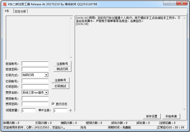 海鸟京东注册机可用于京东三绑账号注册,接入打码和短信验证码平台,实现全自动操作,采用多线程,稳定高效。支持ADSL换IP,减少黑号。