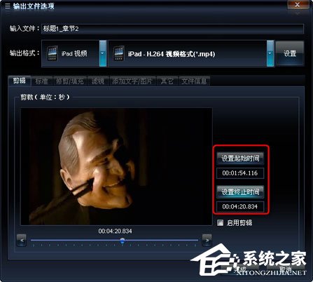 2、设置转换时间段:选中要转换的文件,然后点击 “剪辑”按钮 ,设置输出文件的起始时间,并可以同步预览要输出的文件;