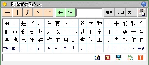 阿峰鼠标输入法免费的,用鼠标打字的输入法软件。使用很简单,只要看一眼就会打,跟手机笔画打字一样,不用专门学习。软件的特点就是:适用于小孩,老人,以及拼音不好的朋友使用。
