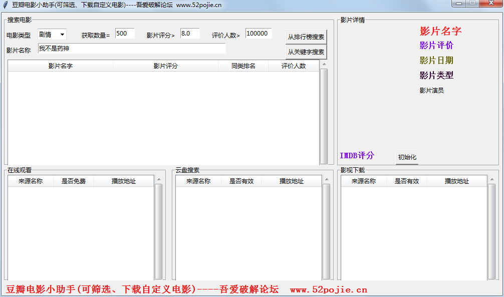豆瓣电影小助手可以通过从排行榜和从影片关键词两种方式爬取电影数据,你可以记录想看、在看和看过的电影电视剧,顺便打分、写影评,极大地方便了人们的生活。可用于需要搜索一些电影,那些评分高且评价人数多的电影,算是对爬虫技术可视化地实践了。
