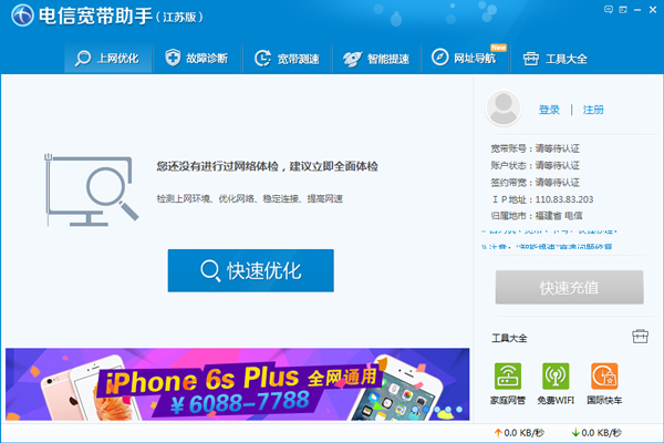 江苏电信宽带助手是一款免费的适用于江苏电信用户的网络辅助工具,可以进行上网优化,修复网络故障,进行宽带测速和提速等。江苏地区的电信用户福音,快来下载使用吧!